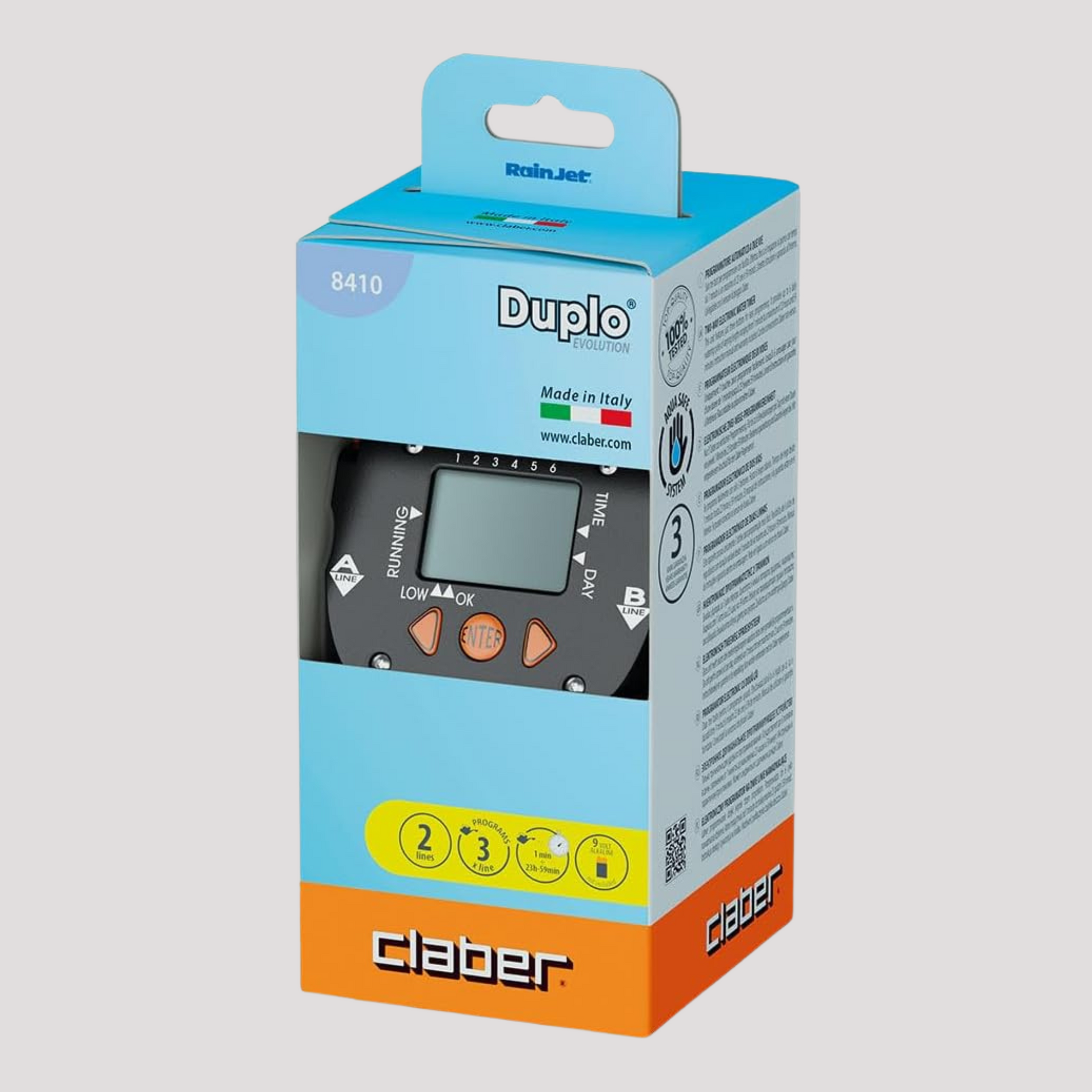 Programmatore automatico a due vie. Effettua fino a tre irrigazioni al giorno per ciascuna linea. Ha solo tre tasti per programmare con facilità. Il display di grande formato comunica chiaramente con simboli e numeri tutte le informazioni necessarie. Tempi di irrigazione da un minuto a 23 ore e 59 minuti. Programmazione settimanale con esclusione dei singoli giorni. Permette di visualizzare i programmi inseriti e di effettuare cancellazioni. Funzione manuale implementabile da 15 e 60 min. Impostazione del giorno corrente. Dotato di filtro lavabile. Funziona con una batteria alcalina da 9 V sufficiente per l’intera stagione (indicatore digitale dello stato di carica). Parte elettronica resistente alla pioggia e all’umidità. Collegabile con il sensore di pioggia Rain Sensor, per un’irrigazione assolutamente senza sprechi. Pressione di esercizio da 0,2 a 12 bar. Controllato e testato al 100%. Diametro filetto entrata: ¾’’ Sistema di aggancio rapido uscita: Quick-Click System Portata: 33 l/min Pressione: 5 bar Uscite: 2 Programmi: 3 per linea Frequenza irrigazione: 3 al giorno o 1 a settimana Durata irrigazione: da 00:01’ a 23:59’ Sensore pioggia: con filo Alimentazione: 1×9v