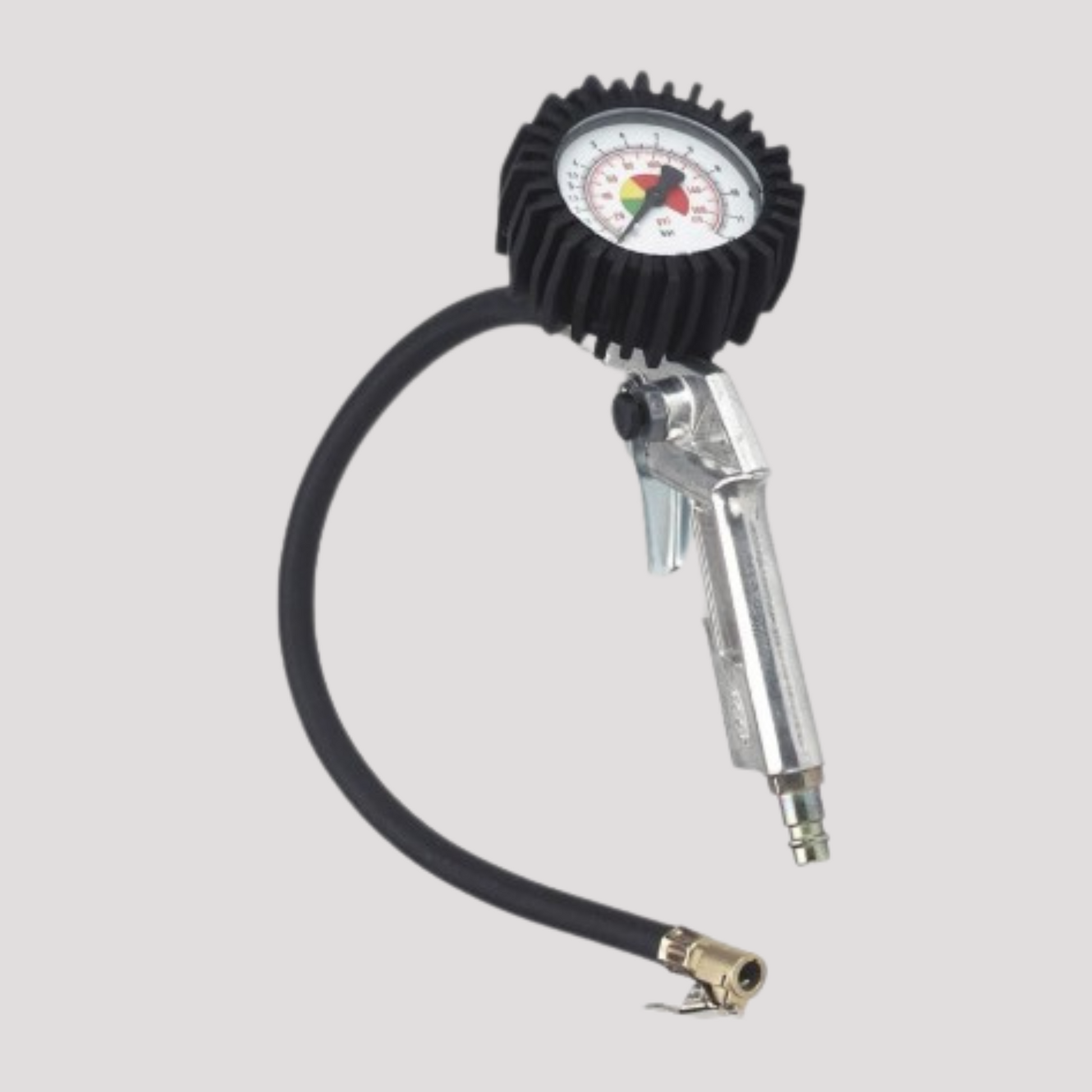 Pistola per gonfiaggio gomme con manometro 4137000 Caratteristiche: Struttura con impugnatura in metallo leggero, manometro integrato e protezione in gomma. Segnala da 0 - 10 bar, raccordo rapido universale.