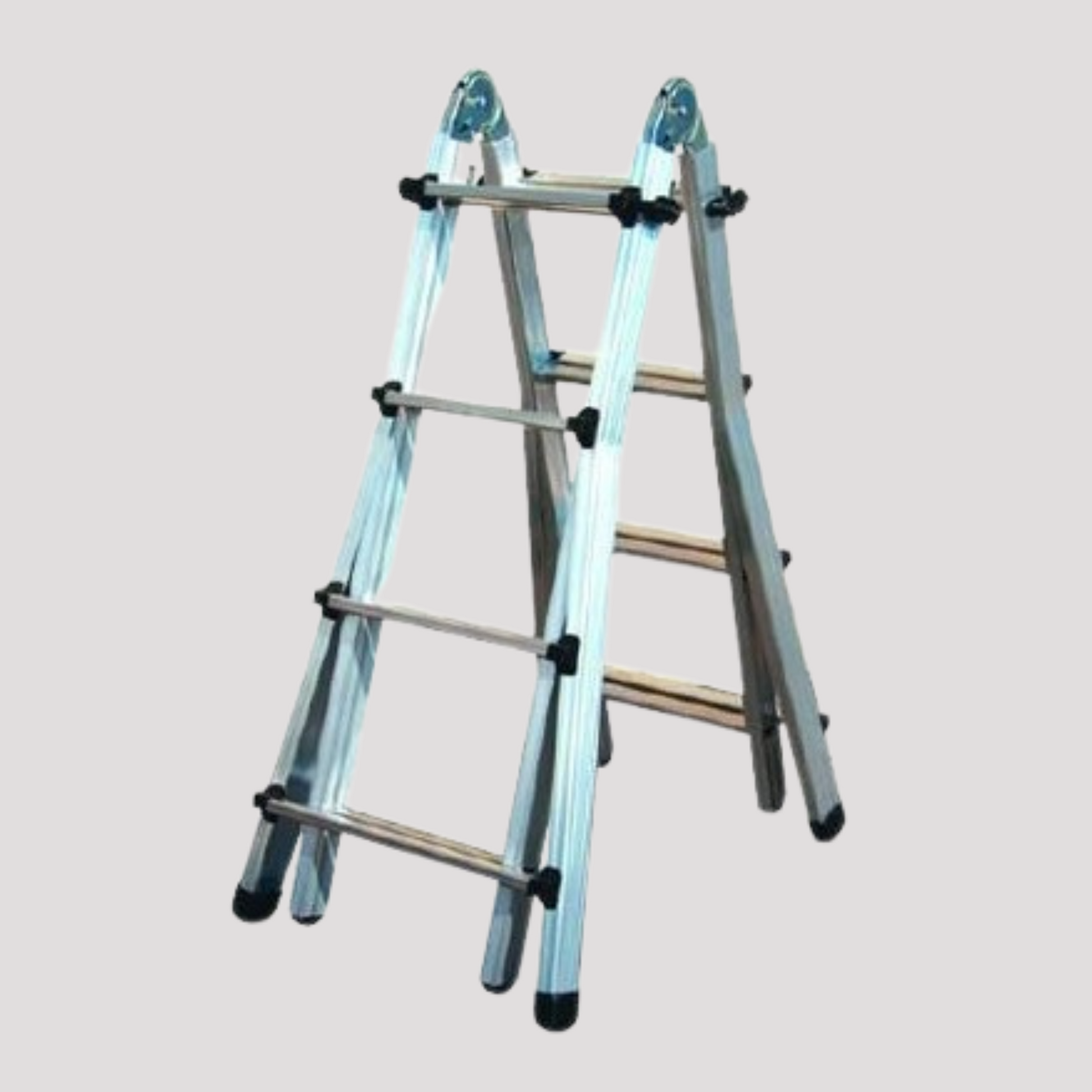Scala telescopica in alluminio estruso. Base allargata che garantisce la massima stabilità. Ganci in acciaio rivestito. Cerniera automatica professionale. Sezione profilo a U da 59x25 mm, sezione gradino 30x30 mm.