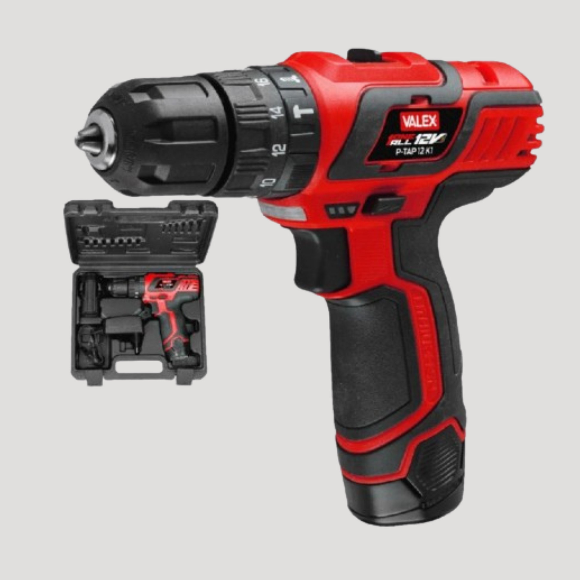 - Trapano avvitatore a percussione Valex P-TAP12 K1 con alimentazione a batteria al litio da 12V compatibile con il sistema OneAll di Valex della stessa categoria di tensione.