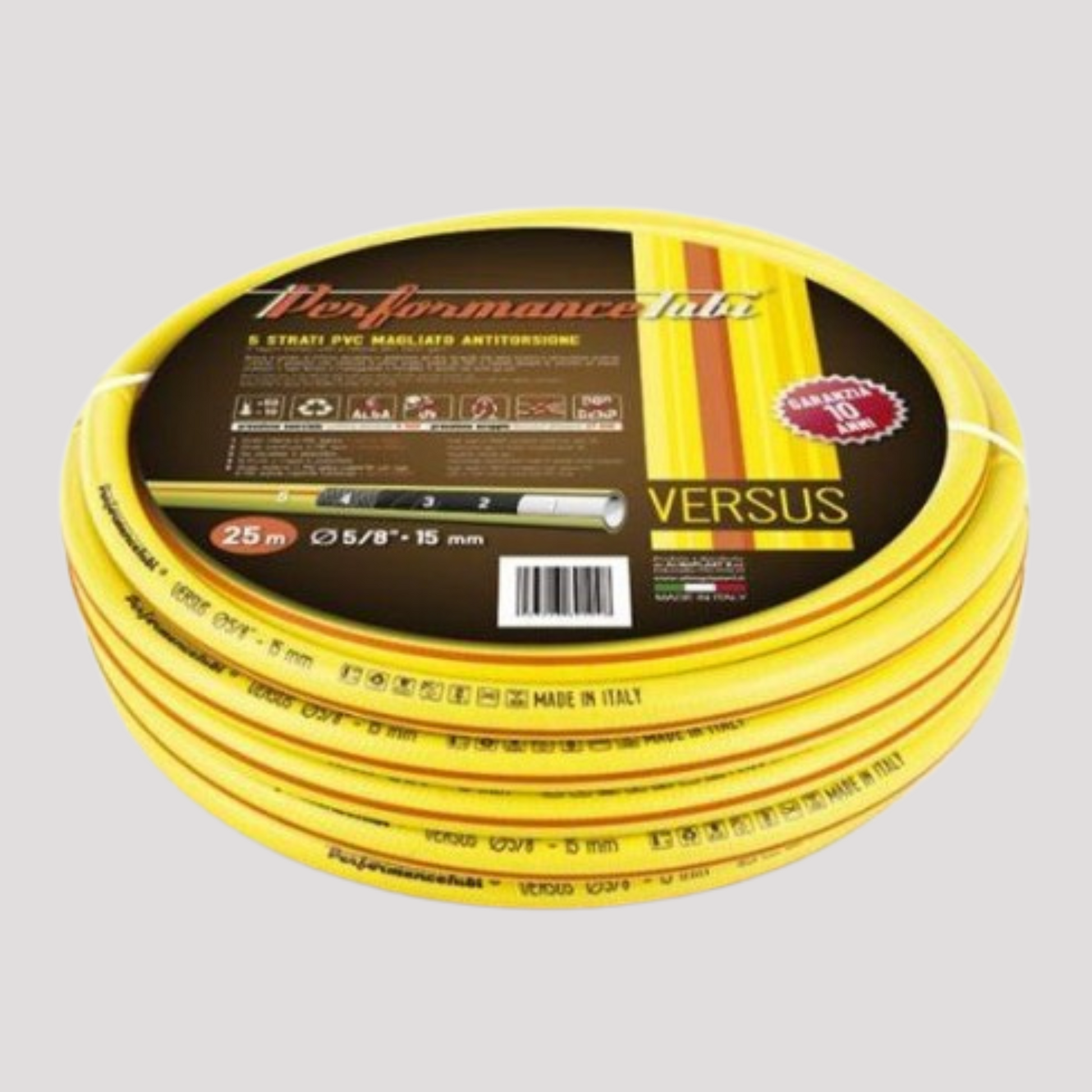 Tubo da irrigazione 5 strati in PVC magliato con filo elicoidale ANTITORSIONE Il tubo Versus è dotato di rinforzo elicoidale in poliestere ad alta tenacità che evita torsioni e strozzature durante l’utilizzo. È prodotto con materiali di prima scelta esenti da DOP e metalli pesanti in accordo con elevati standard. Il tubo Versus è maneggevole e flessibile. È adatto per tutti gli usi Strato interno in PVC bianco atossico Strato coestruso in PVC nero antialga Filo elicoidale in poliestere Rinforzo a maglia in poliestere Strato esterno in PVC giallo coprente con riga in PVC arancione coprente coestrusai.